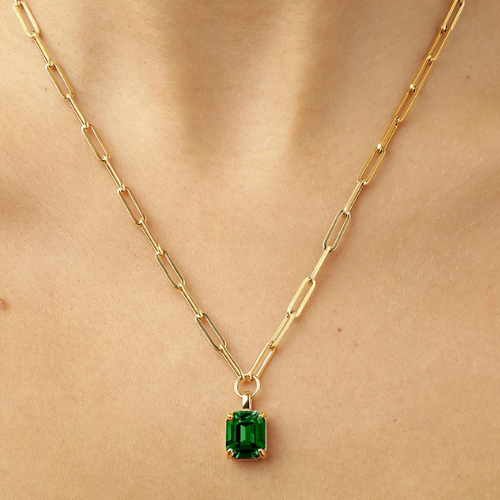 OCTA – A beautiful and Art Deco inspired classic neck chain of 45 cm + 5 cm extension, plated stainless steel – and adorned with a solitaire emerald cut crystal set in a classic prong setting. Here shown in a wonderful emetald green version on gold .DANISH DESIGN – free of cadmium, lead and nickel.