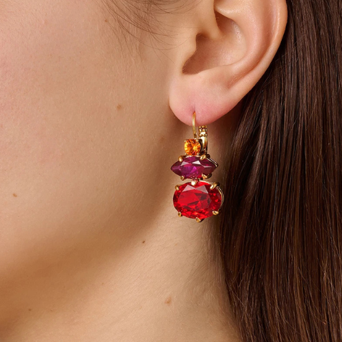 PARSANA is a decorative and feminine earring, provided with a closed surgical steel hook clasp. The three different faceted crystals work together in a beautiful play of colours, here in red, pink and fuchsia tones on gold-toned metal. The length is a tot